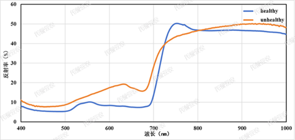 7. 病蟲害分析:可適用于植物病蟲害試驗(yàn),進(jìn)行病斑部分和健康部分光譜反射曲線進(jìn)行對比,通過對變化趨勢的研究可以對病害發(fā)生部分和嚴(yán)重程度進(jìn)行分析;
